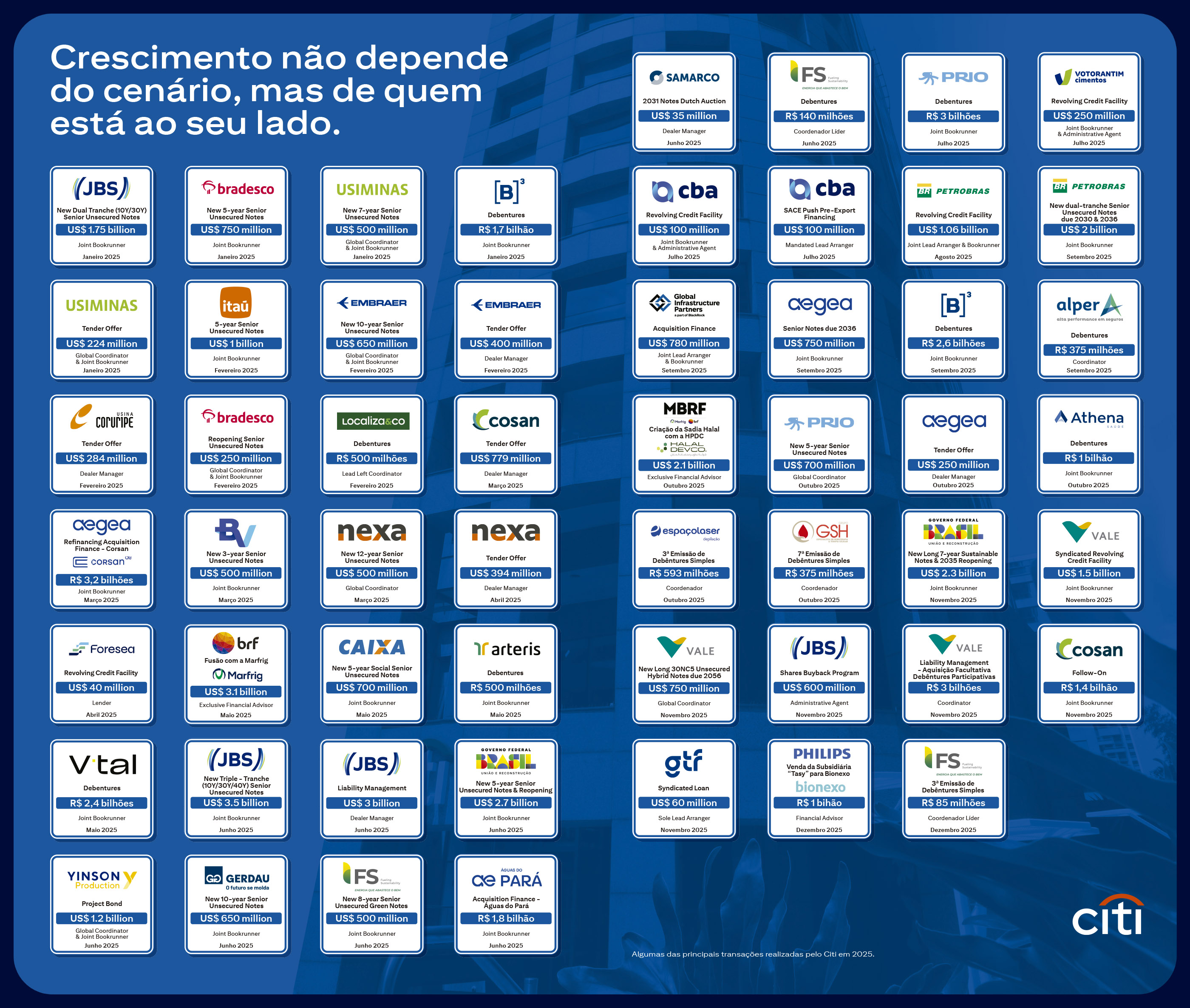 Nosso histórico de sucesso na execução de transações em condições de mercado dinâmicas e desafiadoras é uma evidência do compromisso do Citi em oferecer serviços da mais alta qualidade a seus clientes.